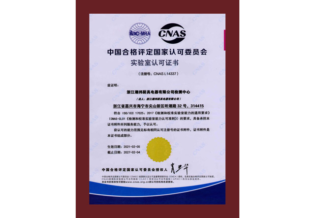 浙江潮邦廚具電器有限公司檢測中心獲CNAS實驗室認可