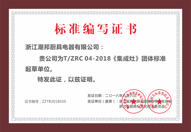 潮邦集成灶被浙江省燃氣具和廚具廚電行業協會授予T/ZRC 04-2018《集成灶》團體標準起草單位